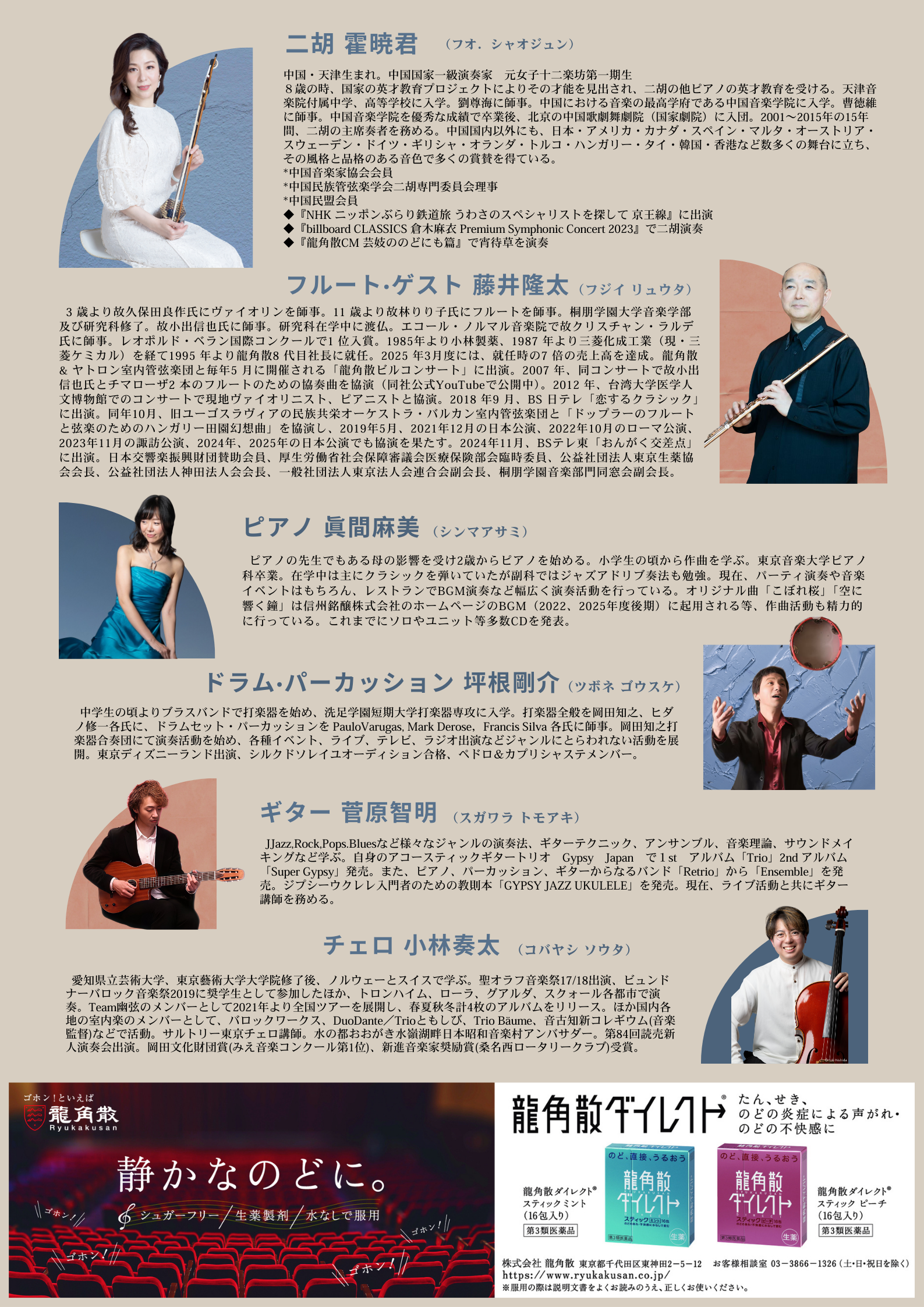 出演者 霍暁君(二胡)・藤井空(ピアノ)・森義丸(チェロ)・坪根剛介(ドラム・パーカッション)・菅原智明(ギター)・高博文(揚琴)